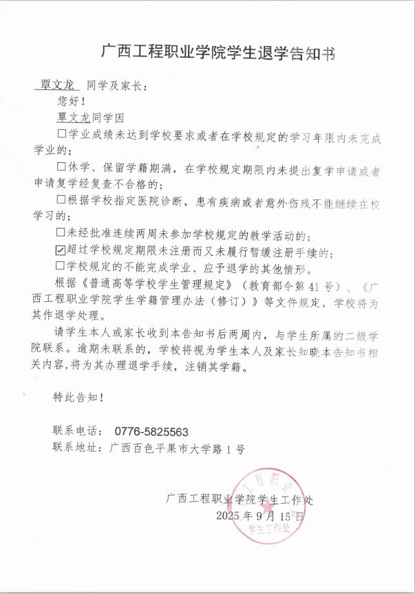 覃文龍,男,學(xué)號(hào):202466020037,藝術(shù)設(shè)計(jì)學(xué)院2024級(jí)建筑室內(nèi)設(shè)計(jì)2班學(xué)生;于2025年8月31日開學(xué)至今未返校,超過學(xué)校規(guī)定期限未注冊(cè)而又未履行暫緩注冊(cè)手續(xù),對(duì)老師的提醒亦不回復(fù),經(jīng)多次聯(lián)系其本人及其家人均無果。學(xué)校于2025年9月16日郵寄退學(xué)告知書,因不是學(xué)生本人及其家人簽收,處理告知書無法以直接送達(dá)、留置方式、郵寄方式送達(dá)本人。根據(jù)《普通高等學(xué)校學(xué)生管理規(guī)定》(教育部令第41號(hào))、《廣西工程職業(yè)學(xué)院學(xué)生學(xué)籍管理辦法(修訂)》規(guī)定,現(xiàn)通過廣西工程職業(yè)學(xué)院藝術(shù)設(shè)計(jì)學(xué)院官網(wǎng)予以公告,公告時(shí)間為2025年9月30日至2025年10月29日,公告期滿,即視為送達(dá)。