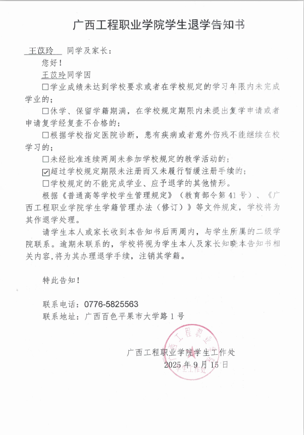 王苡玲,女,學(xué)號(hào):202466020055,藝術(shù)設(shè)計(jì)學(xué)院2024級(jí)建筑室內(nèi)設(shè)計(jì)2班學(xué)生;于2025年8月31日開學(xué)至今未返校,超過學(xué)校規(guī)定期限未注冊(cè)而又未履行暫緩注冊(cè)手續(xù),對(duì)老師的提醒亦不回復(fù),經(jīng)多次聯(lián)系其本人及其家人均無果。學(xué)校于2025年9月16日郵寄退學(xué)告知書,因不是學(xué)生本人及其家人簽收,處理告知書無法以直接送達(dá)、留置方式、郵寄方式送達(dá)本人。根據(jù)《普通高等學(xué)校學(xué)生管理規(guī)定》(教育部令第41號(hào))、《廣西工程職業(yè)學(xué)院學(xué)生學(xué)籍管理辦法(修訂)》規(guī)定,現(xiàn)通過廣西工程職業(yè)學(xué)院藝術(shù)設(shè)計(jì)學(xué)院官網(wǎng)予以公告,公告時(shí)間為2025年9月30日至2025年10月29日,公告期滿,即視為送達(dá)。