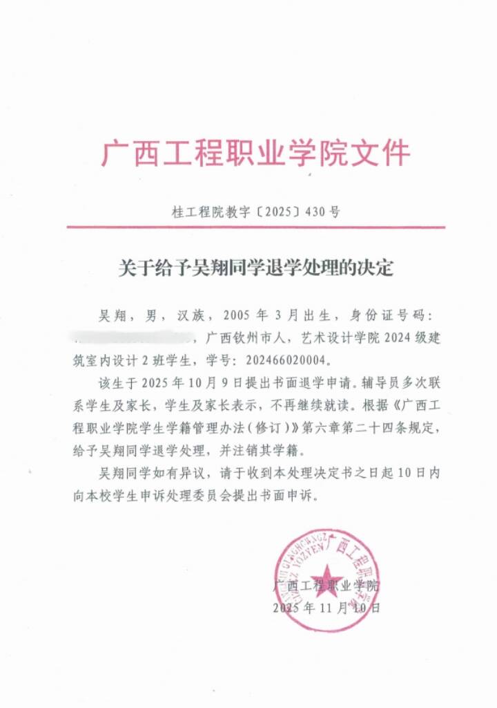 根據(jù)《普通高等學校學生管理規(guī)定》(教育部令第41號)《廣西工程職業(yè)學院學生學籍管理辦法(修訂)》第二十四規(guī)定,給予吳翔同學退學處理,同時注銷其學籍。