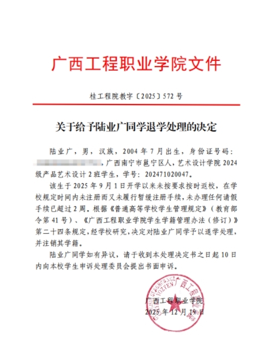 該生于2025年9月1日開學以來未按要求按時返校,在學校規(guī)定時間內(nèi)未注冊而又未履行暫緩注冊手續(xù),未辦理任何請假手續(xù)已超過2周。根據(jù)《普通高等學校學生管理規(guī)定》(教育部令第41號)、《廣西工程職業(yè)學院學生學籍管理辦法(修訂)》第二十四條規(guī)定,經(jīng)學校研究,決定對陸業(yè)廣同學予以退學處理,并注銷其學籍。