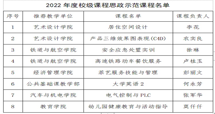 根據(jù)《關(guān)于開展2022年度校級課程思政示范課申報的通知》(桂工程院〔2022〕13號)要求,經(jīng)教師申報、學(xué)院推薦、專家評審、網(wǎng)站公示,我校確定《居住空間設(shè)計》等8門課程為2022年度校級課程思政示范課程。名單如下: