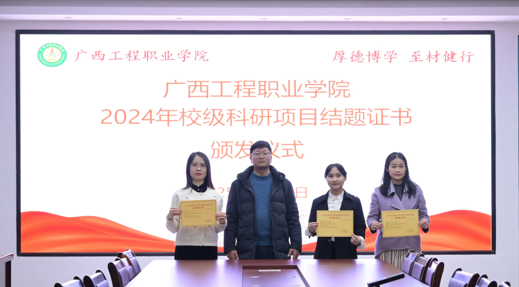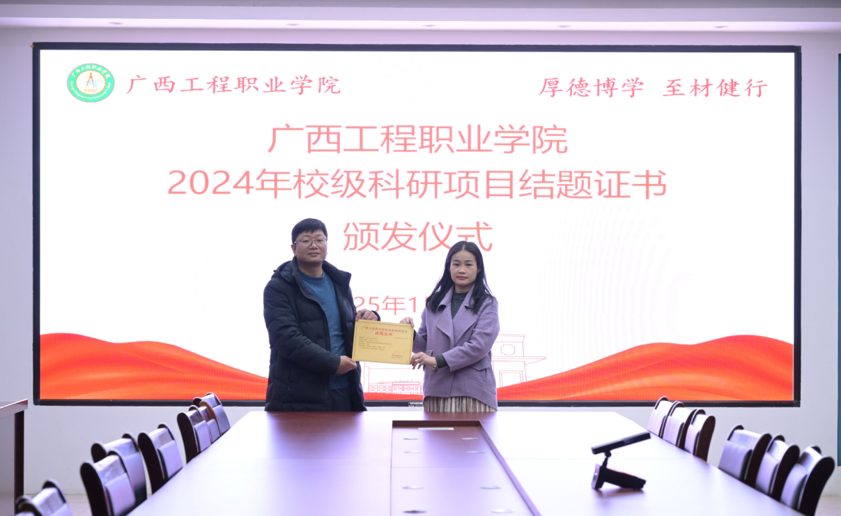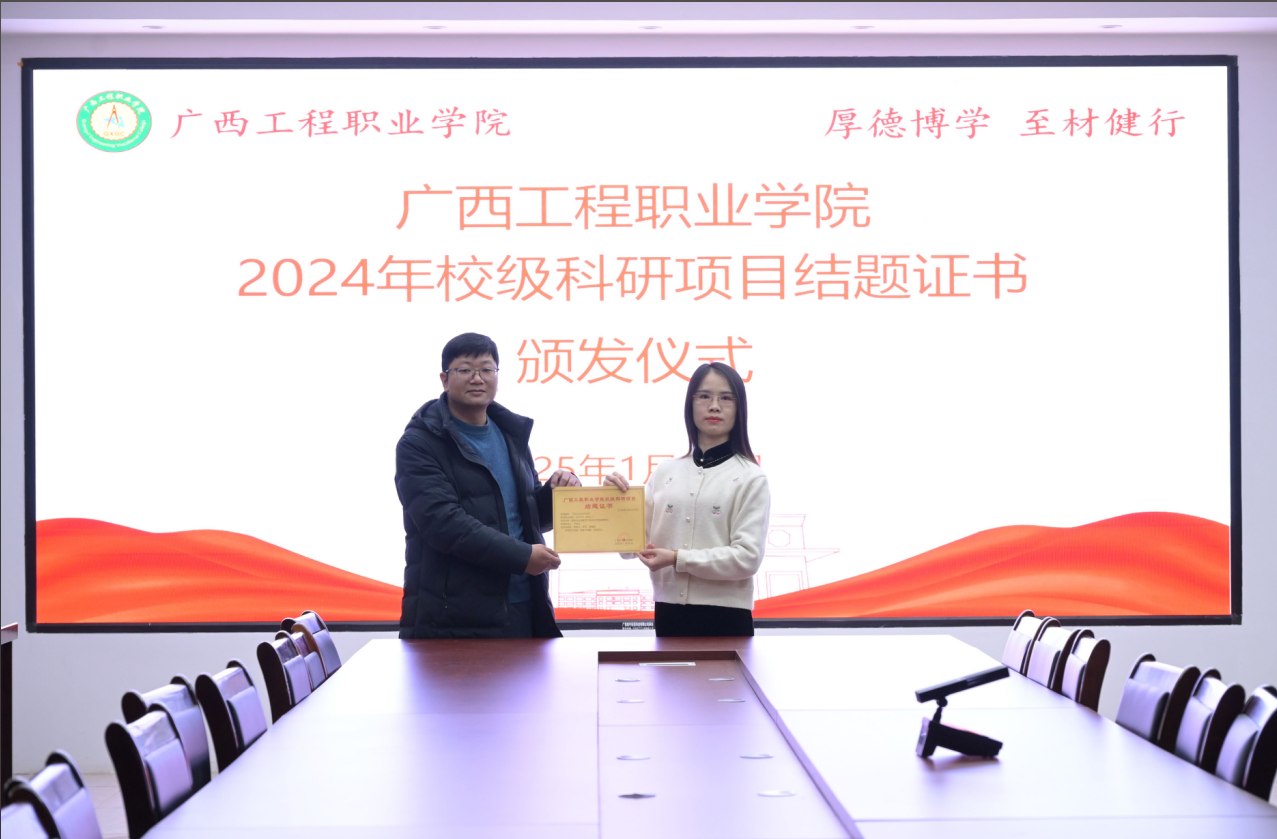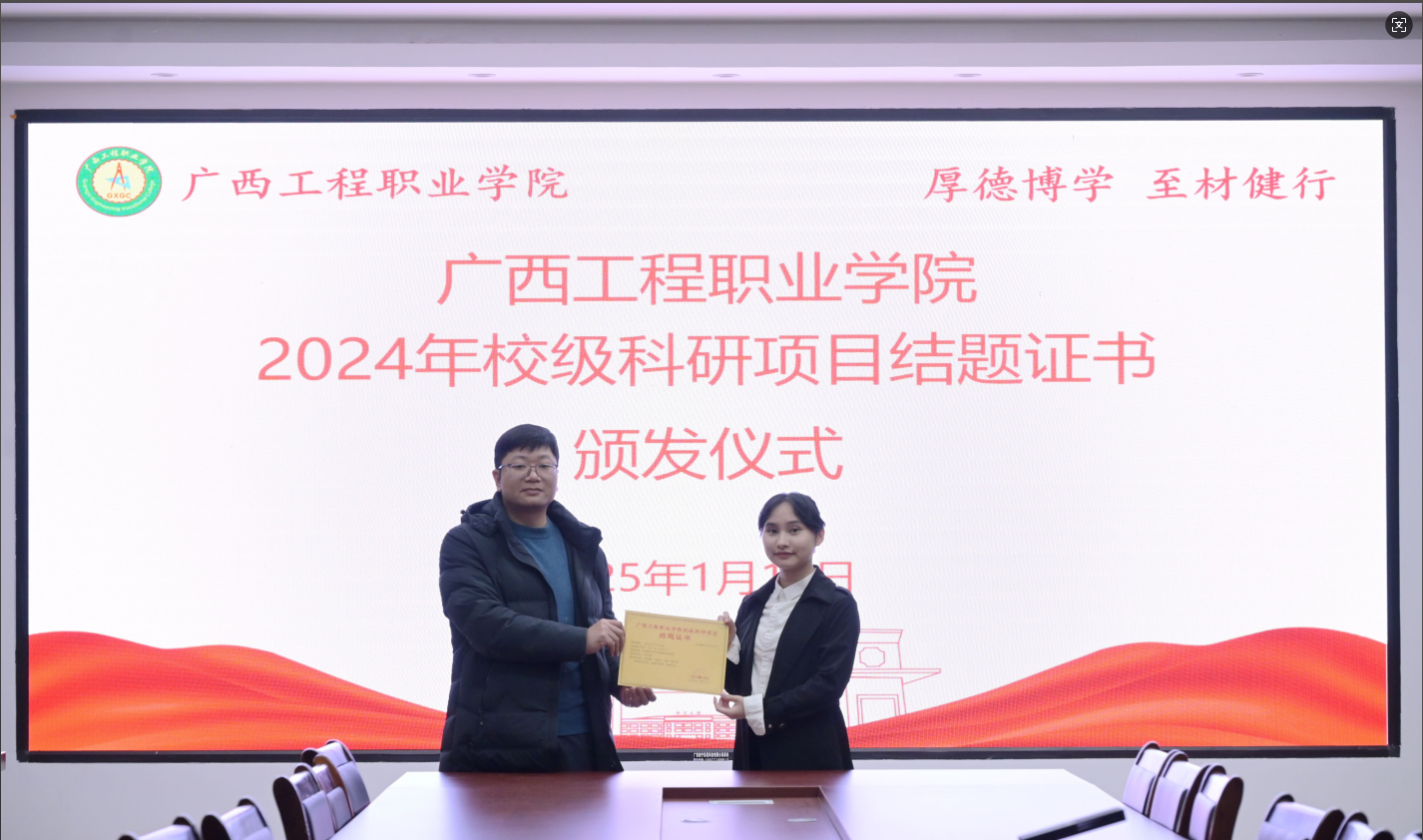2025年1月15日,2024年校級科研項目結題證書頒發(fā)儀式在圖書館大數(shù)據(jù)中心舉行,科研處科長藍桂敏為上述3個項目頒發(fā)了結題證書,并給予各項目組深切的勉勵,希望他們繼續(xù)發(fā)揚刻苦鉆研精神,深耕教壇,潛心研究,再接再厲,在教學和科研的道路上以更優(yōu)異的成績?yōu)閰^(qū)域經濟建設和學校高質量發(fā)展貢獻力量。