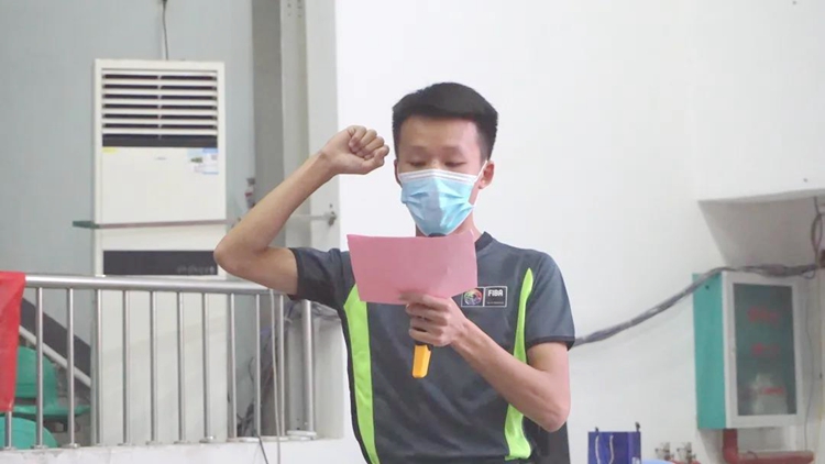 裁判員代表梁政進(jìn)行宣誓,表示全體裁判員將堅(jiān)守崗位,恪盡職守,公平裁決,嚴(yán)格履行裁判員職責(zé),預(yù)祝本次“新生杯”籃球取得圓滿成功!
