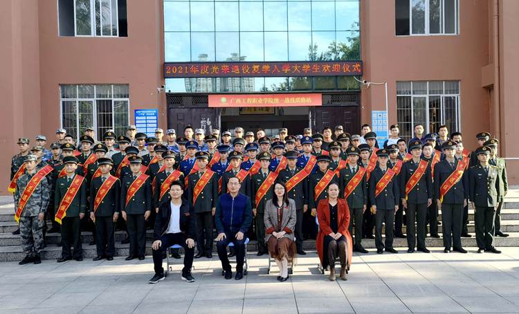 儀式結(jié)束,學(xué)校副校長(zhǎng)黃德偉副教授,校長(zhǎng)助理黃秋霞及相關(guān)與會(huì)領(lǐng)導(dǎo)和退役復(fù)學(xué)入學(xué)同學(xué)合影留念。