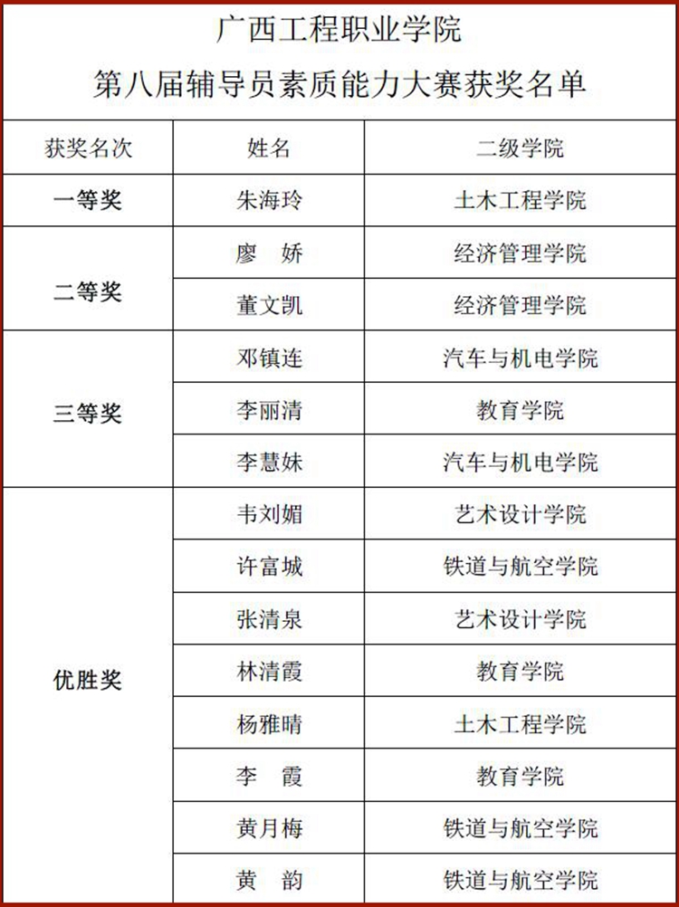 經(jīng)過(guò)實(shí)力大比拼,土木工程學(xué)院輔導(dǎo)員朱海玲榮獲一等獎(jiǎng),經(jīng)濟(jì)管理學(xué)院輔導(dǎo)員廖嬌、董文凱榮獲二等獎(jiǎng),汽車與機(jī)電學(xué)院輔導(dǎo)員鄧鎮(zhèn)連、李慧妹及教育學(xué)院輔導(dǎo)員李麗清榮獲三等獎(jiǎng)。出席比賽的學(xué)校領(lǐng)導(dǎo)為獲獎(jiǎng)選手頒獎(jiǎng)。