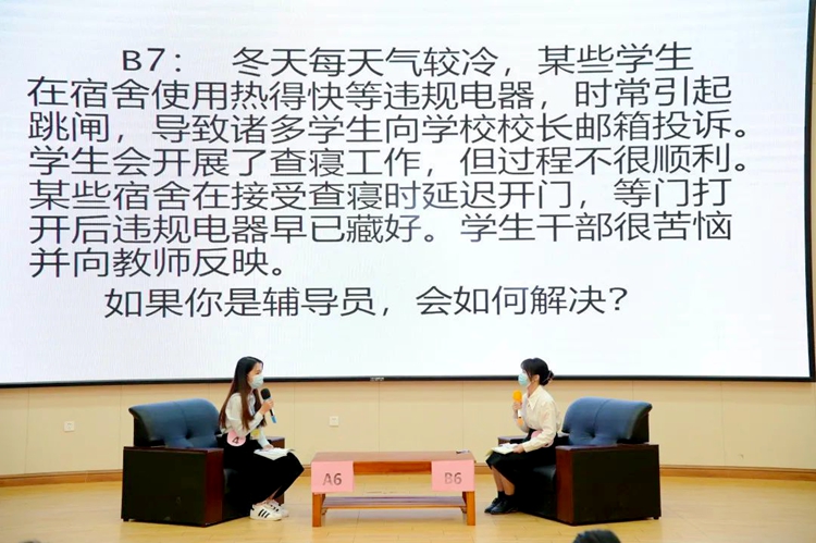 經(jīng)過(guò)初賽“基礎(chǔ)知識(shí)測(cè)試”環(huán)節(jié),共有14名輔導(dǎo)員進(jìn)入4月9日決賽的“談心談話”和“案例研討”環(huán)節(jié)比賽。 “談心談話”主要考察輔導(dǎo)員對(duì)學(xué)生特征、學(xué)生成長(zhǎng)成才規(guī)律的了解把握程度,對(duì)學(xué)生的教育引導(dǎo)能力、解決理論困惑和實(shí)際問(wèn)題的能力等;“案例研討”主要考察輔導(dǎo)員綜合運(yùn)用理論分析問(wèn)題、研判問(wèn)題、解決問(wèn)題的能力,同時(shí)考察輔導(dǎo)員對(duì)學(xué)生基本情況的了解和掌握程度。