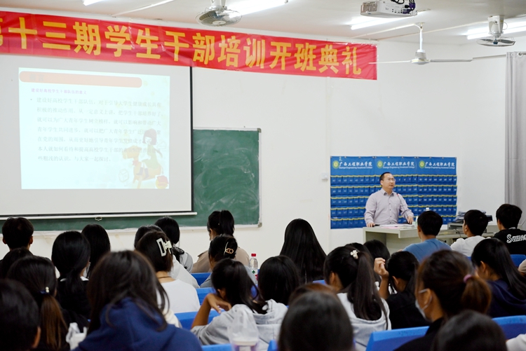在開(kāi)班儀式上,學(xué)校紀(jì)委書(shū)記彭高彬作干部培訓(xùn)動(dòng)員講話(huà)。他要求全體學(xué)生干部要深入學(xué)習(xí)貫徹黨的二十大精神,堅(jiān)持以習(xí)近平新時(shí)代中國(guó)特色社會(huì)主義思想為指導(dǎo),不斷加強(qiáng)思想政治引領(lǐng),引導(dǎo)廣大同學(xué)堅(jiān)定聽(tīng)黨話(huà),永遠(yuǎn)跟黨走;要牢記服務(wù)同學(xué)的根本宗旨,創(chuàng)新服務(wù)載體和工作方式,不斷提升學(xué)生會(huì)組織的同學(xué)滿(mǎn)意度、大局貢獻(xiàn)度、社會(huì)認(rèn)可度;要牢記習(xí)近平總書(shū)記的囑托,勇做有理想、敢擔(dān)當(dāng)、能吃苦、肯奮斗的新時(shí)代好青年,團(tuán)結(jié)廣大同學(xué)建功新時(shí)代,奮進(jìn)新征程。