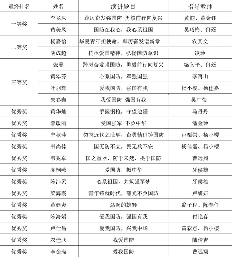 附:廣西工程職業(yè)學(xué)院2023年“愛我國防”演講比賽獲獎名單