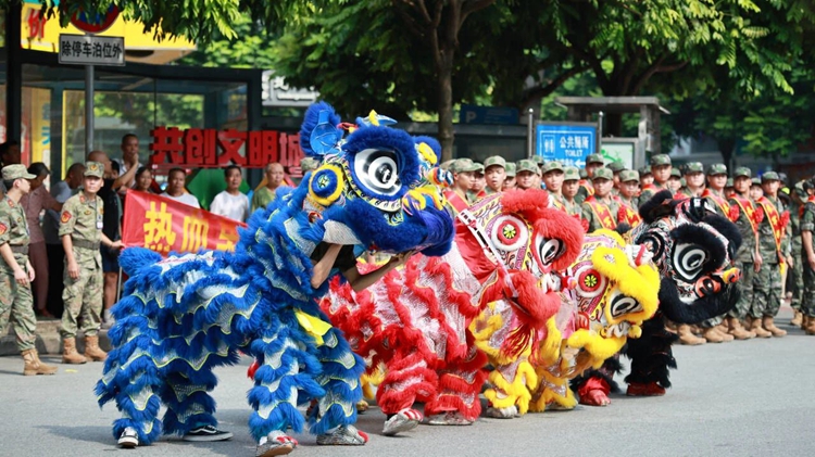 靈動的獅子在鑼鼓聲中跳躍、舞動寓意著新兵們在部隊中能夠如龍似虎,勇往直前