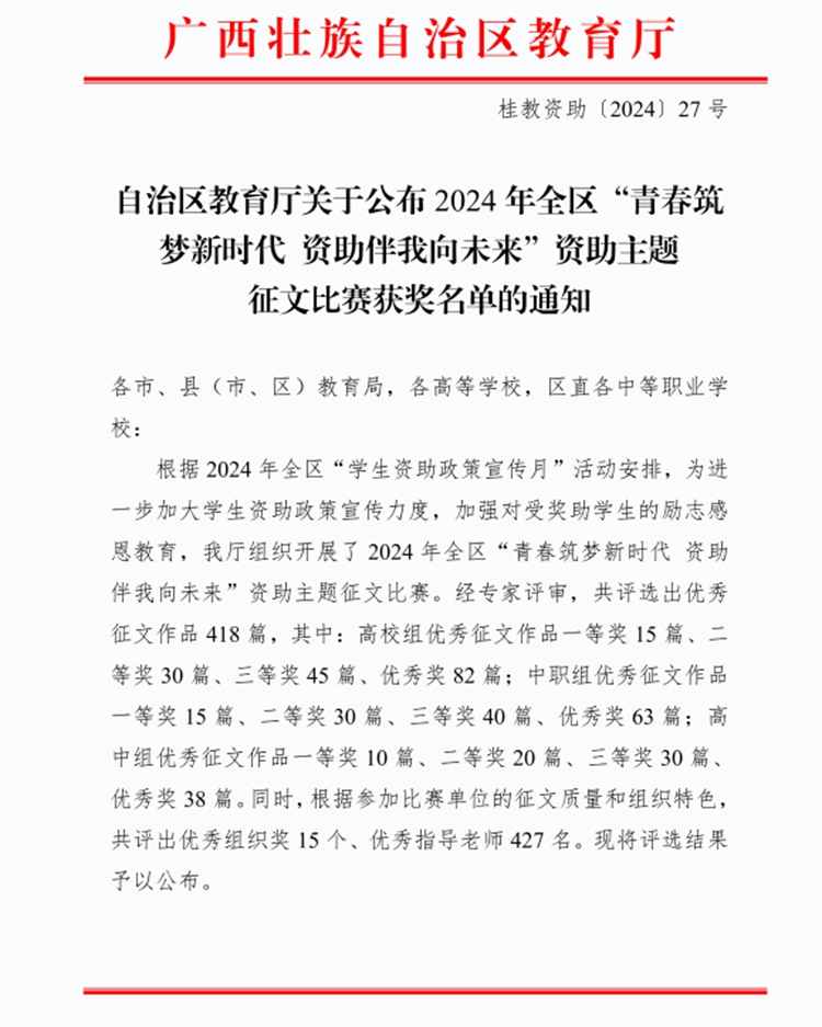 圖為自治區(qū)教育廳關(guān)于公布2024年全區(qū)“青春筑夢(mèng)新時(shí)代,資助伴我向未來”資助主題征文比賽獲獎(jiǎng)名單的通知