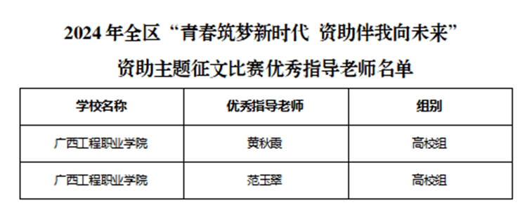 近日,自治區(qū)教育廳公布2024年全區(qū)“青春筑夢(mèng)新時(shí)代 資助伴我向未來”資助主題征文比賽獲獎(jiǎng)名單,我校周秀建同學(xué)的作品《資助相伴,譜青春奮斗之曲》榮獲三等獎(jiǎng)、黃美慧同學(xué)的作品《感恩資助,奮勇前行》榮獲優(yōu)秀獎(jiǎng),黃秋霞、范玉翠兩位老師獲評(píng)優(yōu)秀指導(dǎo)老師。