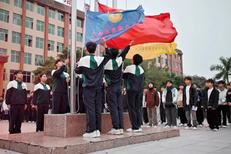 12月9日上午7:20,學校在魯班廣場舉行2024年憲法宣傳周升旗儀式暨國旗下的思政課。副校長蔣茂麗、黨委宣傳部部長黃麗娟、法務部部長盧保日及相關部門負責人出席儀式。儀式由經濟管理學院黨支部書記、院長覃清香主持。教師代表及2024級新生、2023級學生代表參加升旗儀式。