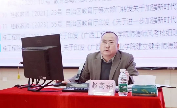紀(jì)委書記、副校長彭高彬作題為《師德師風(fēng)警示教育》的專題培訓(xùn)。他主要從新時代的師德師風(fēng)建設(shè)、違反師德師風(fēng)的具體表現(xiàn)、違反師德師風(fēng)的典型案例、典型案例的警示教育意義和做“四有”好老師當(dāng)育人大先生這五個方面進(jìn)行培訓(xùn),強(qiáng)調(diào)全體教師一要嚴(yán)格遵守《新時代高校教師職業(yè)行為十項準(zhǔn)則》,牢固樹立底線意識,切實增強(qiáng)遵守師德準(zhǔn)則的思想覺悟和行動自覺;二要不斷提高自身的專業(yè)素養(yǎng)和師德修養(yǎng),爭做“四有”好老師,當(dāng)育人大先生,切實擔(dān)負(fù)起為黨育人、為國育才的使命;三要以案為鑒,汲取教訓(xùn),警鐘長鳴,始終堅守教師的職業(yè)道德規(guī)范,嚴(yán)守師德底線,絕不觸碰“紅線”,堅決杜絕出現(xiàn)任何師德失范行為。