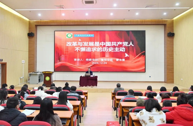 黨委書記、督導(dǎo)專員蒙本曼作題為《改革與發(fā)展是中國共產(chǎn)黨人不懈追求的歷史主動》的專題培訓(xùn),深刻闡述了“改革具有舉旗定向的里程碑意義”“發(fā)展是改革的落腳點(diǎn)和必由之路”和“改革與發(fā)展當(dāng)并駕齊驅(qū)相輔相成”三部分內(nèi)容。他要求全體教師要把歷史主動精神融入新時代立德樹人全過程,解放思想、深化改革、強(qiáng)化使命擔(dān)當(dāng),大力弘揚(yáng)教育家精神,不斷提高師德修養(yǎng),努力成為“大先生”,當(dāng)好引路人,以釘釘子精神推動學(xué)校各項教育改革舉措落地生根、開花結(jié)果,培養(yǎng)更多適應(yīng)新質(zhì)生產(chǎn)力要求的創(chuàng)新型技術(shù)技能型人才,為全面建成社會主義現(xiàn)代化強(qiáng)國、實現(xiàn)第二個百年奮斗目標(biāo),以中國式現(xiàn)代化全面推進(jìn)中華民族偉大復(fù)興作出廣工程院人的新貢獻(xiàn)。