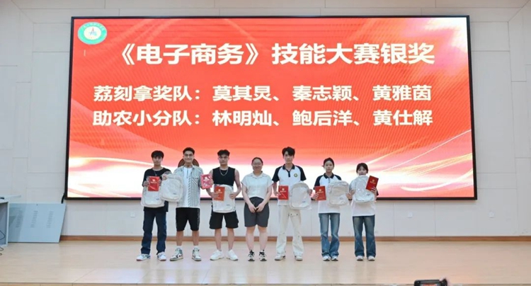 圖為財(cái)會(huì)教研室主任石娜為荔刻拿獎(jiǎng)隊(duì)、助農(nóng)小分隊(duì)頒發(fā)銀獎(jiǎng)榮譽(yù)證書(shū)和獎(jiǎng)品