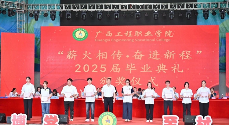 圖為黨委副書(shū)記、校長(zhǎng)羅艷妮為被評(píng)為廣西工程職業(yè)學(xué)院2025屆優(yōu)秀畢業(yè)生的學(xué)生代表頒獎(jiǎng)