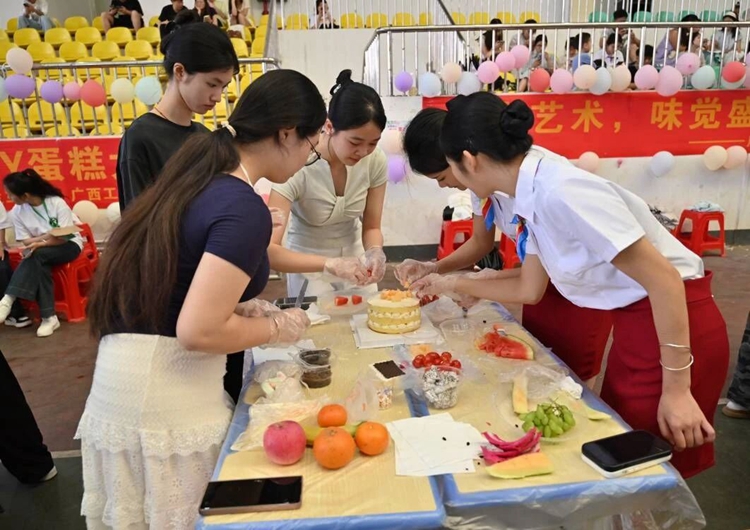 黨委書(shū)記、督導(dǎo)專員蒙本曼,副校長(zhǎng)黃德偉,校長(zhǎng)助理李明澤,校長(zhǎng)助理梁善雅以及各部門負(fù)責(zé)人出席活動(dòng)現(xiàn)場(chǎng)。來(lái)自各部門、各二級(jí)學(xué)院的師生代表和學(xué)生社團(tuán)代表分別組成參賽隊(duì)伍同臺(tái)競(jìng)技,用創(chuàng)意的蛋糕作品為學(xué)校送上最真摯的生日祝福。