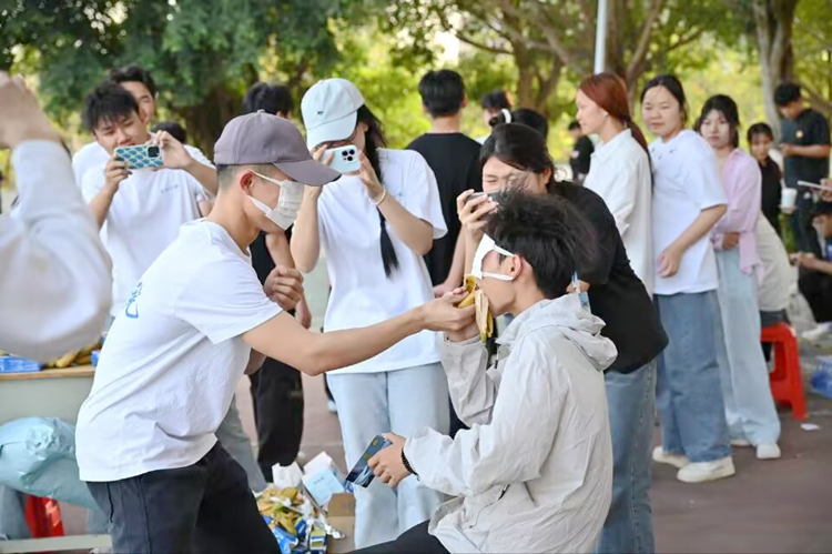 圖為蒙眼吃香蕉游戲現(xiàn)場