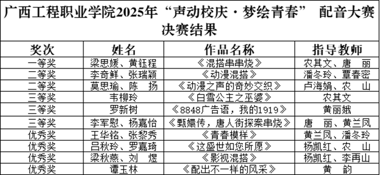 十八載櫛風(fēng)沐雨,十八載桃李芬芳。為了慶祝廣西工程職業(yè)學(xué)院建校十八周年,4月10日,學(xué)校在圖文信息大樓一樓學(xué)術(shù)報(bào)告廳開展“聲動校慶·夢繪青春”配音大賽。廣工程院學(xué)子們以聲波為筆,以時(shí)代為卷,用飽含深情的聲音為母校送上最真摯的祝福。