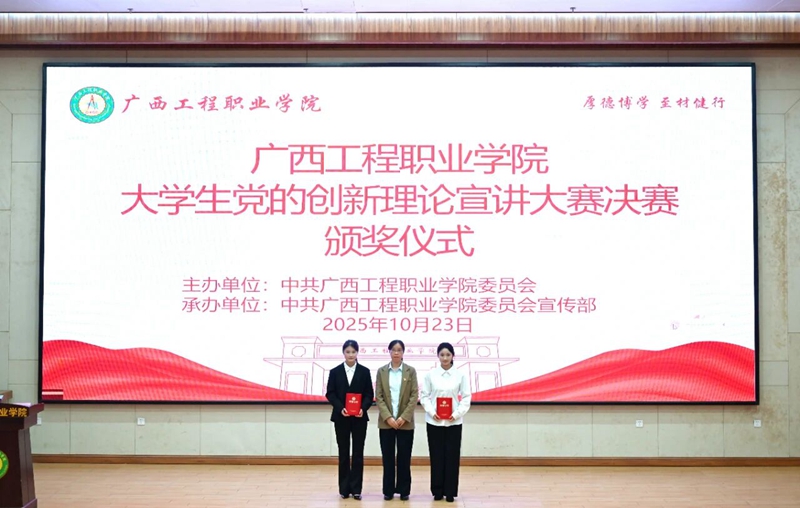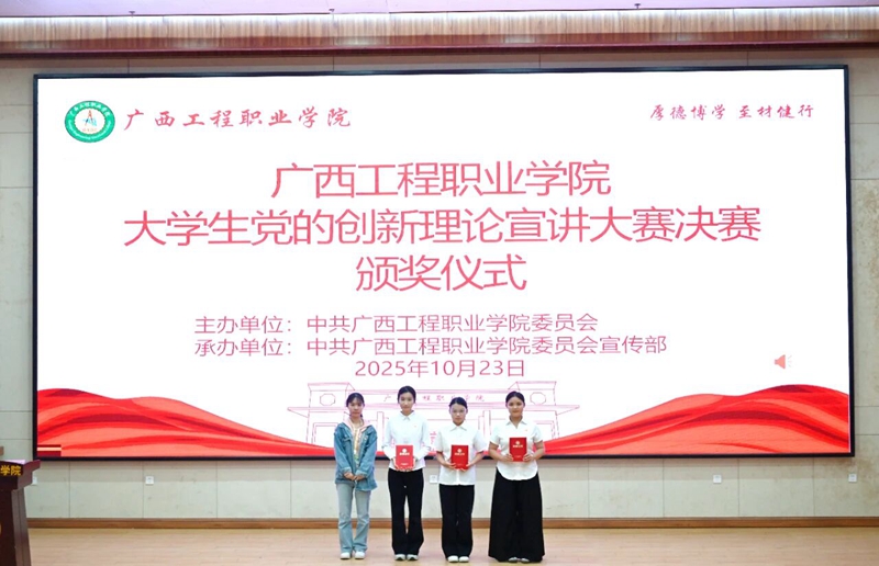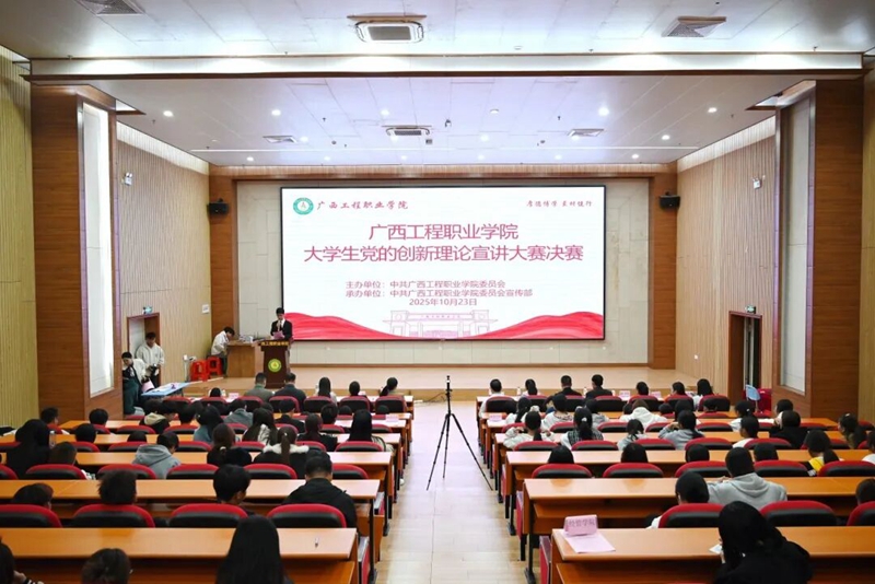 為進(jìn)一步推動(dòng)學(xué)習(xí)宣傳貫徹習(xí)近平新時(shí)代中國特色社會(huì)主義思想走深走實(shí)走心,增進(jìn)我校學(xué)生對(duì)黨的創(chuàng)新理論的政治認(rèn)同、思想認(rèn)同、理論認(rèn)同、情感認(rèn)同,10月23日晚,廣西工程職業(yè)學(xué)院大學(xué)生黨的創(chuàng)新理論宣講大賽決賽在圖文信息大樓一樓學(xué)術(shù)報(bào)告廳舉行。學(xué)校黨委書記、政府督導(dǎo)專員蒙本曼出席現(xiàn)場,黨委辦公室、黨委宣傳部、各黨組織書記(副書記)及二級(jí)學(xué)院師生代表400多人到場觀賽。