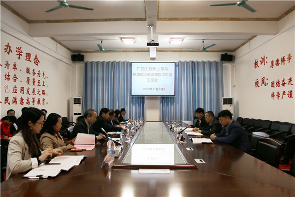 11月23日上午,廣西高校思想政治理論課教學(xué)巡察組專家在組長(zhǎng)百色學(xué)院黨委副書記徐魁峰教授帶領(lǐng)下,桂林電子科技大學(xué)馬克思主義學(xué)院鄧國(guó)峰教授、廣西大學(xué)馬克思主義學(xué)院楊通進(jìn)教授、百色學(xué)院馬克思主義學(xué)院院長(zhǎng)韋順國(guó)教授一行4人,蒞臨廣西工程職業(yè)學(xué)院開展思想政治理論課教學(xué)工作巡察。