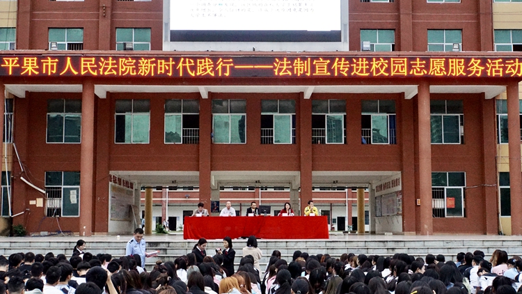 平果市人民法院現(xiàn)場(chǎng)把法制教育宣傳資料發(fā)給學(xué)生