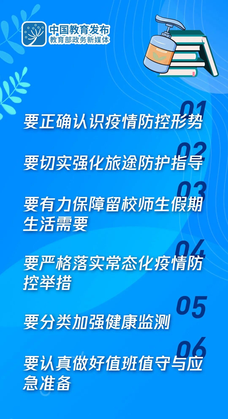 通知指出,要正確認識疫情防控形勢。“五一”假期來臨,各地教育部門和學校要高度重視“五一”假期疫情防控,堅持常態(tài)化精準防控和應(yīng)急處置相結(jié)合,鞏固拓展疫情防控成果,確保廣大師生安全快樂度假。