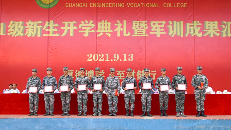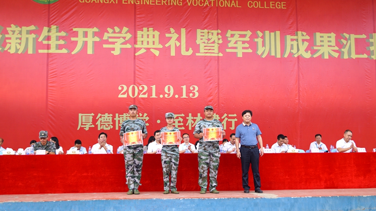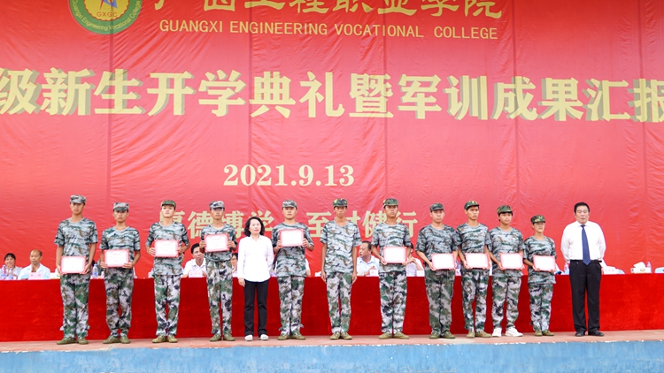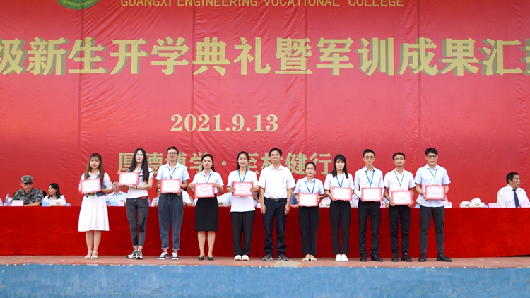 學(xué)校黨委委員、副校長、宣傳部長彭高彬宣讀《廣西工程職業(yè)學(xué)院關(guān)于2021級新生軍訓(xùn)先進(jìn)集體和先進(jìn)個人的表彰決定》,郭乃瑛、李榮寧等311名同學(xué)榮獲“軍訓(xùn)標(biāo)兵”榮譽(yù)稱號,田紅靜、成天祺等21位老師榮獲“軍訓(xùn)優(yōu)秀帶班班主任”榮譽(yù)稱號,張騰、蘇寶等11名教官榮獲“軍訓(xùn)優(yōu)秀帶班教官”榮譽(yù)稱號,八營二連、七營六連等6個連隊(duì)榮獲先進(jìn)集體榮譽(yù)稱號。出席大會的領(lǐng)導(dǎo)嘉賓分別為獲得榮譽(yù)稱號的集體和個人頒發(fā)榮譽(yù)證書和錦旗。