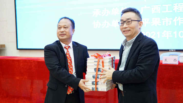講座上,廣西文聯(lián)主席、廣西作家協(xié)會(huì)主席、廣西民族大學(xué)教授向平果市文聯(lián)、廣西工程職業(yè)學(xué)院贈(zèng)送新作《回響》。學(xué)校紀(jì)委書記李益代表學(xué)校接受了書籍捐贈(zèng)。田代琳教授還為獲贈(zèng)新書的文學(xué)愛好者們親筆簽名,送上祝福和希望。