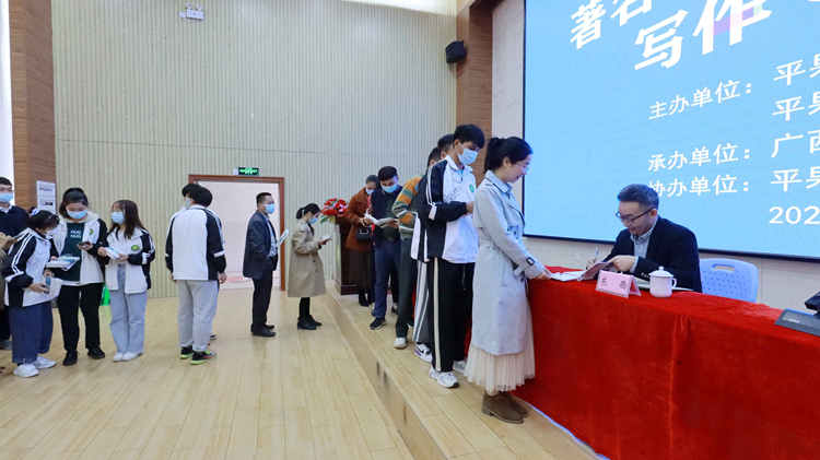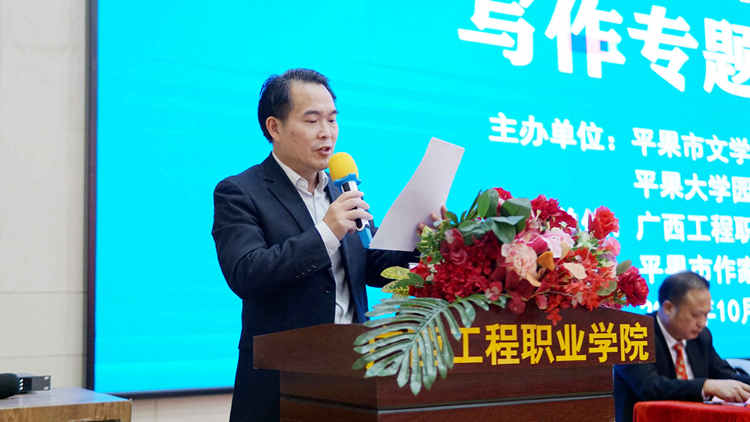平果市作家協(xié)會(huì)會(huì)員、平果大學(xué)園區(qū)各高校文學(xué)社團(tuán)及文學(xué)愛好者200余人聆聽講座。講座由平果市委常委、宣傳部部長(zhǎng)陳丹主持。