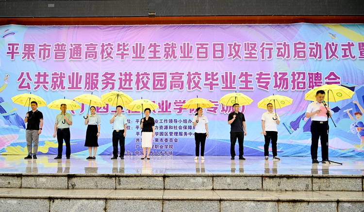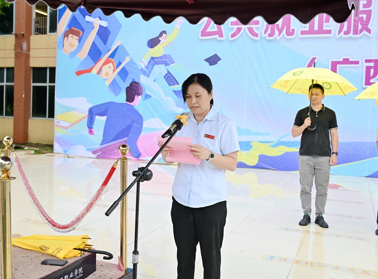 平果市人民政府副市長農(nóng)麗秋,市委組織部副部長(兼)、市人力資源和社會保障局黨組書記陳民民,平果市大學(xué)園區(qū)黨工委書記、管理服務(wù)中心黨組書記、主任許安著,我校校長助理梁善雅,平果市人社局副局長潘華,共青團(tuán)平果市委員會副書記黃必怡,平果市公共就業(yè)和人才服務(wù)中心主任覃歡,平果市產(chǎn)業(yè)工人服務(wù)中心主任農(nóng)仕超,廣西人才市場百色分市場負(fù)責(zé)人莫盛奎出席啟動儀式。儀式由陳民民副部長主持。