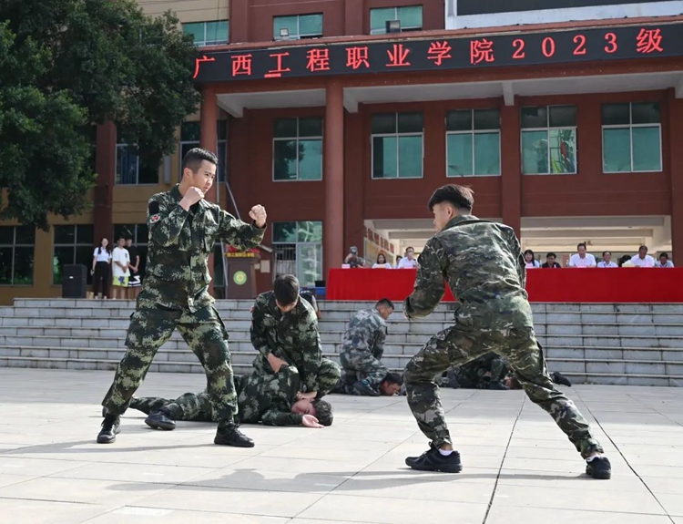緊接著,軍訓(xùn)教官對軍事訓(xùn)練內(nèi)容進(jìn)行演練。他們身穿整齊的軍裝,神情嚴(yán)肅,口號洪亮,動作利落,剛猛有力,精彩的軍事演練贏得了陣陣掌聲。