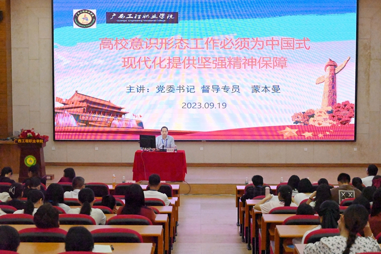 9月19日下午,在圖文信息大樓一樓學(xué)術(shù)報(bào)告廳,學(xué)校召開中國(guó)式現(xiàn)代化暨高校意識(shí)形態(tài)工作專題報(bào)告會(huì),學(xué)校黨委書記、督導(dǎo)專員蒙本曼博士作《高校意識(shí)形態(tài)工作必須為中國(guó)式現(xiàn)代化提供堅(jiān)強(qiáng)精神保障》專題報(bào)告。學(xué)校副校長(zhǎng)蔣茂麗,學(xué)校黨組織書記、副書記,各部門負(fù)責(zé)人、行政人員,各專任教師和輔導(dǎo)員等400多人參加會(huì)議。會(huì)議由黨委辦副主任黃香琴主持。