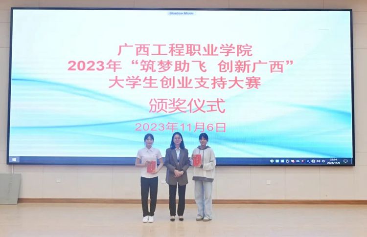 土木工程學(xué)院黨總部支書記、副院長(zhǎng)楊竟及汽車與機(jī)電學(xué)院黨支部書記、辦公室主任陸心含為榮獲二等獎(jiǎng)的《校園云資訊》《壯韻—壯錦飾品》項(xiàng)目團(tuán)隊(duì)頒獎(jiǎng)