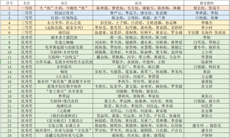經(jīng)過一系列激烈的競(jìng)爭(zhēng),最終《大“機(jī)”大利,今晚吃“機(jī)”》項(xiàng)目獲得一等獎(jiǎng),《校園云資訊》《壯韻—壯錦飾品》項(xiàng)目獲得二等獎(jiǎng),《東方美學(xué),匠心之旅》《走陳皮路,振家鄉(xiāng)興》《福田園》項(xiàng)目獲得三等獎(jiǎng)。