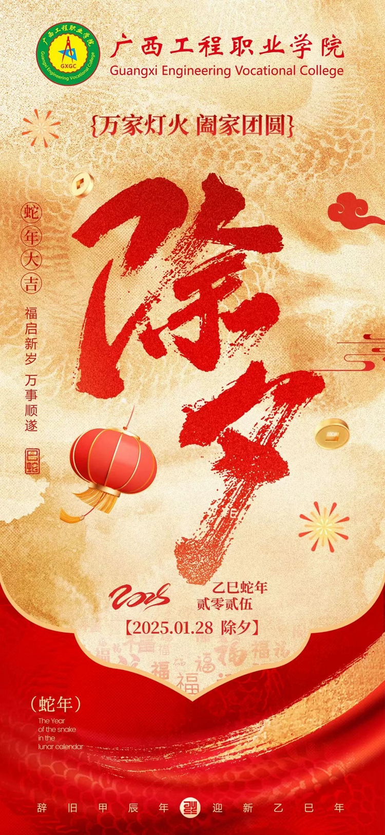 蛇舞新春至,祥光映福門。舊歲千般皆如意,新年萬事定稱心,農(nóng)歷乙巳年春節(jié)到來之際,廣西工程職業(yè)學(xué)院祝全體師生新年快樂!