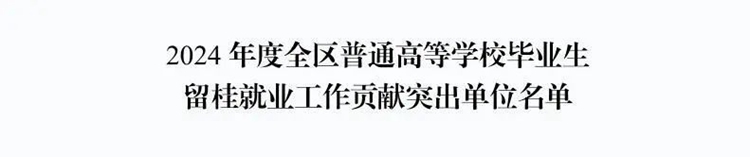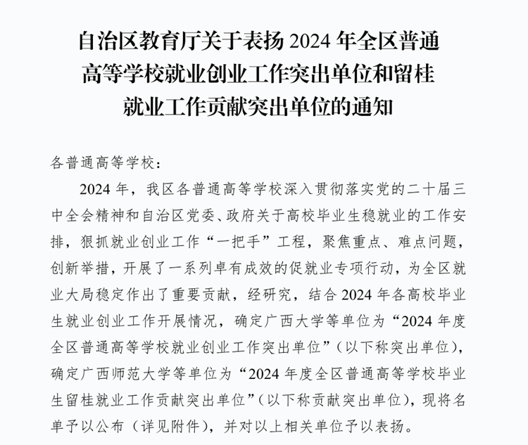 近日,根據(jù)廣西壯族自治區(qū)教育廳下發(fā)的《自治區(qū)教育廳關(guān)于表揚(yáng)2024年全區(qū)普通高等學(xué)校就業(yè)創(chuàng)業(yè)工作突出單位和留桂就業(yè)工作貢獻(xiàn)突出單位的通知》(桂教學(xué)生〔2024〕25號(hào))文件,我校被認(rèn)定為“全區(qū)普通高等學(xué)校畢業(yè)生留桂就業(yè)工作貢獻(xiàn)突出單位”,這是我校就業(yè)工作連續(xù)第3年獲得自治區(qū)級(jí)表彰。