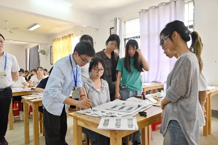 在韋國慶老師的指導下,學生從執(zhí)筆入手,掌握書寫技巧,體會單字結(jié)構(gòu)與整體布局之美。傳統(tǒng)書法與現(xiàn)代教學結(jié)合,既提升學生書寫能力,也讓書法藝術(shù)在課堂煥發(fā)生機。