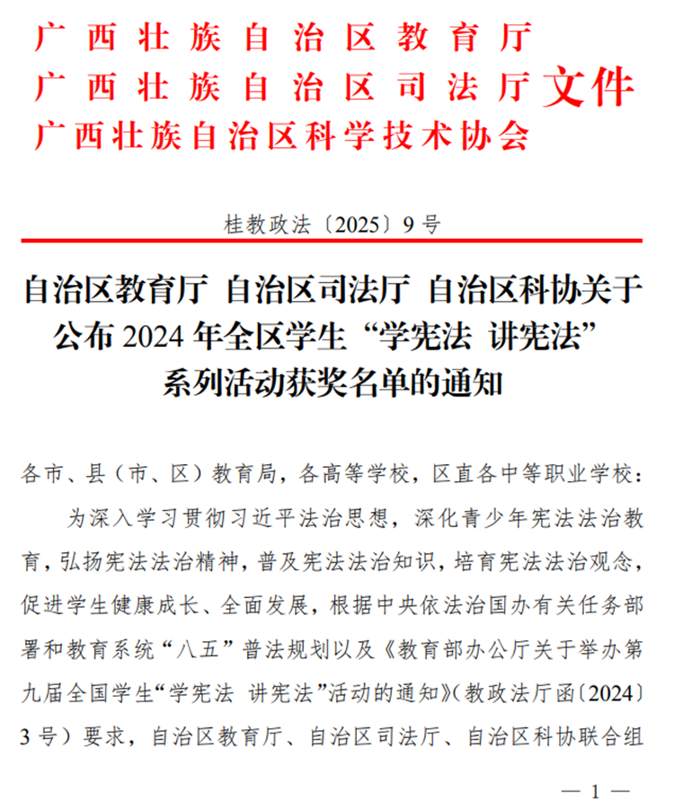 近日,自治區(qū)教育廳、自治區(qū)司法廳、自治區(qū)科協(xié)公布2024年全區(qū)學(xué)生“學(xué)憲法 講憲法”系列活動(dòng)獲獎(jiǎng)名單,廣西工程職業(yè)學(xué)院喜獲2024年全區(qū)學(xué)生“學(xué)憲法 講憲法”系列活動(dòng)“優(yōu)秀組織獎(jiǎng)”。