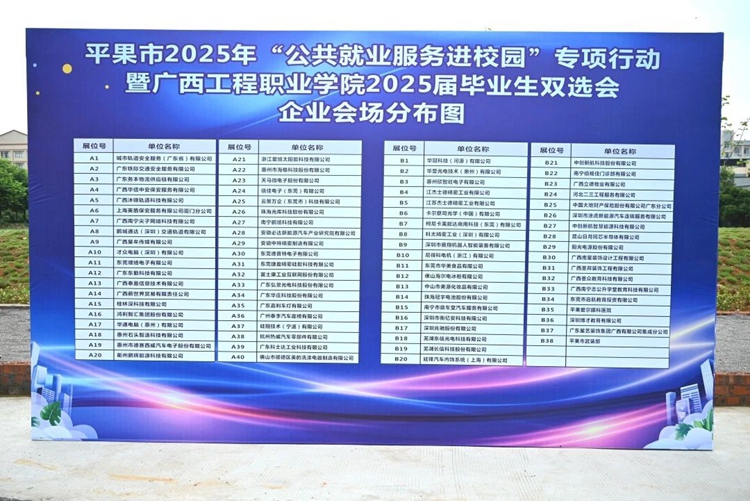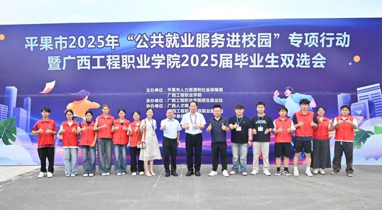為做好畢業(yè)生就業(yè)工作,搶抓就業(yè)關(guān)鍵期,搭建畢業(yè)生和用人單位精準(zhǔn)對接平臺,全力促進我校畢業(yè)生更充分、更高質(zhì)量就業(yè),2025年6月24日上午,由平果市人力資源和社會保障局、廣西工程職業(yè)學(xué)院共同舉辦的平果市2025年“公共就業(yè)服務(wù)進校園”專項行動暨廣西工程職業(yè)學(xué)院2025屆畢業(yè)生雙選會在體育館主干道舉行。