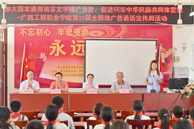 廣西工程職業(yè)學(xué)院校長(zhǎng)助理梁善雅致辭。她向太平鎮(zhèn)中心小學(xué)的師生們表達(dá)了衷心感謝,也向?yàn)榛顒?dòng)提供周到安排的老師們致以誠(chéng)摯敬意。她表示,語(yǔ)言是文化的載體、溝通的橋梁。推廣國(guó)家通用語(yǔ)言文字,既是法律賦予的責(zé)任,更是增進(jìn)民族凝聚力、傳承中華優(yōu)秀傳統(tǒng)文化,也能為助力鄉(xiāng)村振興和教育高質(zhì)量發(fā)展筑牢基礎(chǔ)。此次活動(dòng)承載著三個(gè)小目標(biāo):