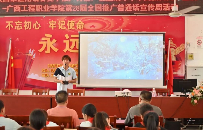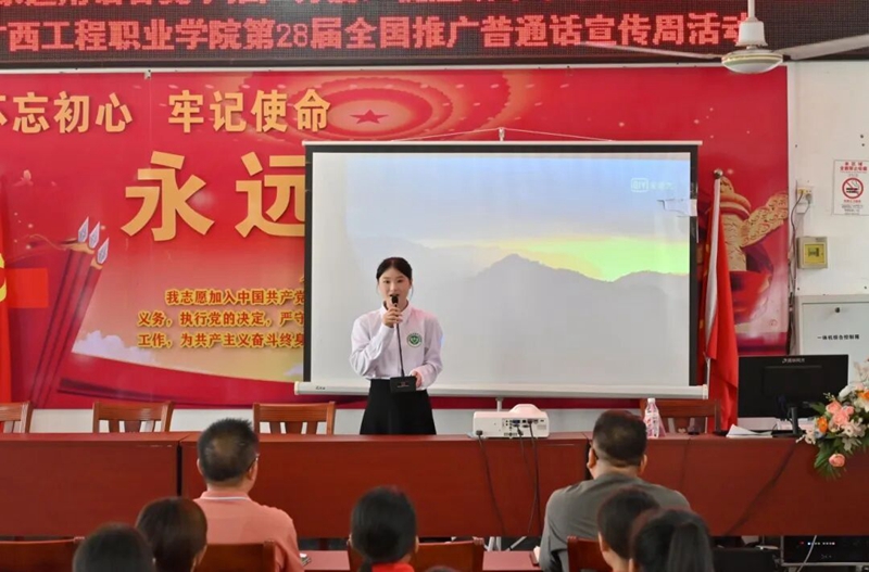 廣西工程職業(yè)學(xué)院學(xué)生代表李奇鮮、莫代總還帶來(lái)了精彩的朗誦表演。兩人身著整齊服裝,精神飽滿地站上舞臺(tái),以標(biāo)準(zhǔn)流利的普通話朗誦經(jīng)典篇目,語(yǔ)調(diào)時(shí)而激昂、時(shí)而舒緩,聲情并茂的演繹極具感染力,臺(tái)下不時(shí)響起陣陣熱烈掌聲。