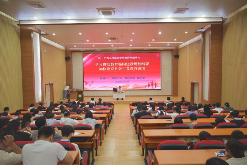 為深入學(xué)習(xí)貫徹《教育強(qiáng)國(guó)建設(shè)規(guī)劃綱要(2024-2035 年)》精神,推動(dòng)教育領(lǐng)域全面深化改革向縱深發(fā)展,夯實(shí)教師隊(duì)伍建設(shè)根基,9月23日下午,廣西工程職業(yè)學(xué)院2025年秋季學(xué)期第一期教師常規(guī)培訓(xùn)在圖文信息大樓一樓學(xué)術(shù)報(bào)告廳舉行。黨委書記、政府督導(dǎo)專員蒙本曼作題為《學(xué)習(xí)貫徹教育強(qiáng)國(guó)建設(shè)規(guī)劃綱要 加快建設(shè)社會(huì)主義教育強(qiáng)國(guó)》的專題講座。