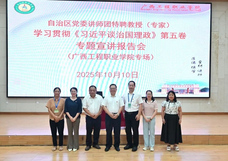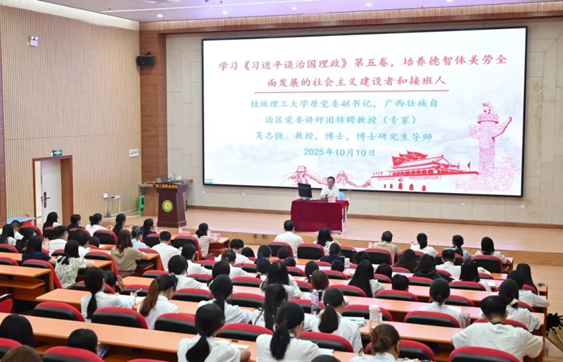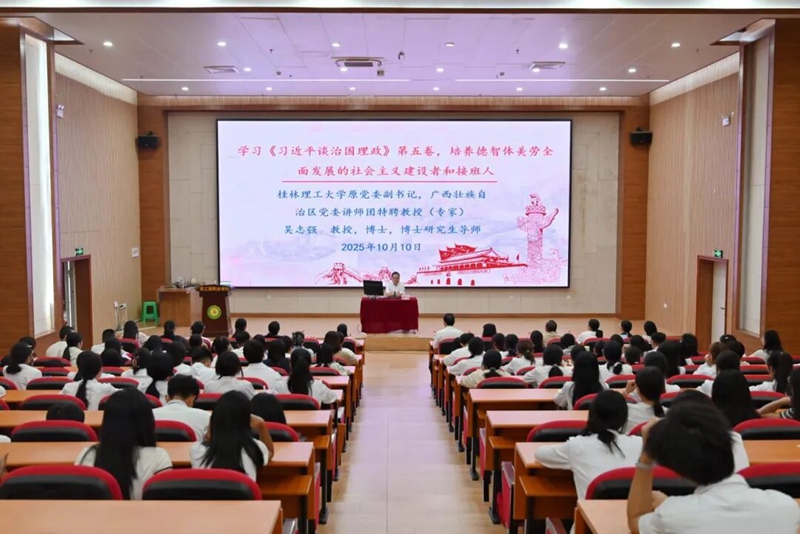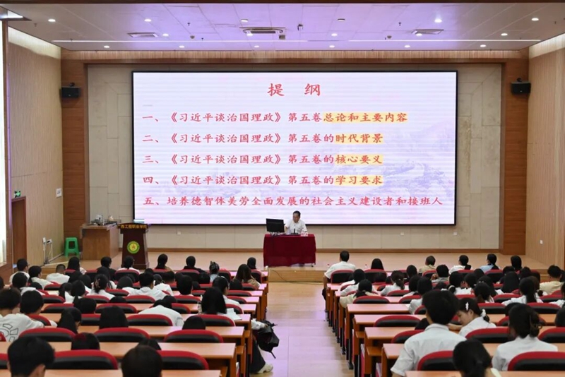 為深入學(xué)習(xí)貫徹習(xí)近平新時(shí)代中國(guó)特色社會(huì)主義思想,在高校中廣泛宣傳《習(xí)近平談治國(guó)理政》第五卷中蘊(yùn)含的新思想、新觀點(diǎn)、新論斷、新舉措,推動(dòng)黨的創(chuàng)新理論入腦入心,10月10日下午,學(xué)校在圖文信息大樓一樓學(xué)術(shù)報(bào)告廳開(kāi)展《習(xí)近平談治國(guó)理政》第五卷專題宣講活動(dòng),自治區(qū)黨委講師團(tuán)特聘教授(專家)、桂林理工大學(xué)原黨委副書(shū)記吳志強(qiáng)教授為師生作宣講報(bào)告。百色市委講師團(tuán)團(tuán)長(zhǎng)肖菊、平果市委宣傳部韋錦鐘副部長(zhǎng)出席宣講會(huì)。學(xué)校黨政班子成員、各部門負(fù)責(zé)人、各黨組織負(fù)責(zé)人、師生代表等350人參加宣講報(bào)告會(huì)。