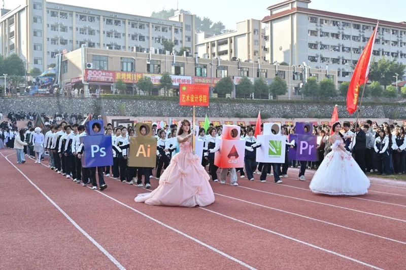 他們將PS、AI等設(shè)計軟件元素融入隊列,展現(xiàn)專業(yè)特色。步伐整齊,姿態(tài)昂揚,舉手投足間盡顯設(shè)計的靈動與執(zhí)著。