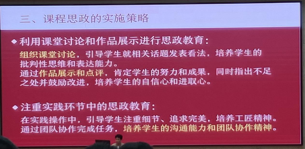 三位主講人的分享各具特色,都緊密圍繞思政要點(diǎn),將思政教育融入專業(yè)課程中,取得了良好的教學(xué)效果。通過此次培訓(xùn),教師們紛紛表示受益匪淺,不僅學(xué)到了更多教學(xué)技巧,也對(duì)如何在專業(yè)課程中融入思政元素有了新的認(rèn)識(shí)和思考。