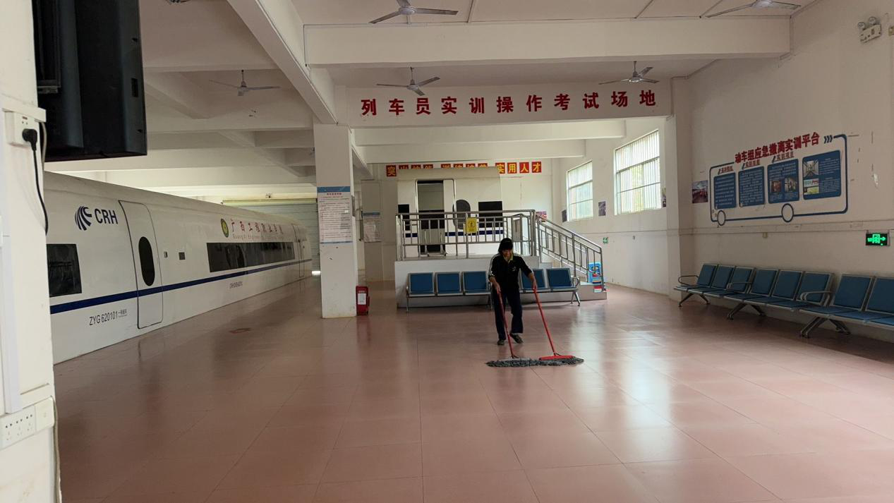 圖為保潔工人打掃實(shí)訓(xùn)室衛(wèi)生