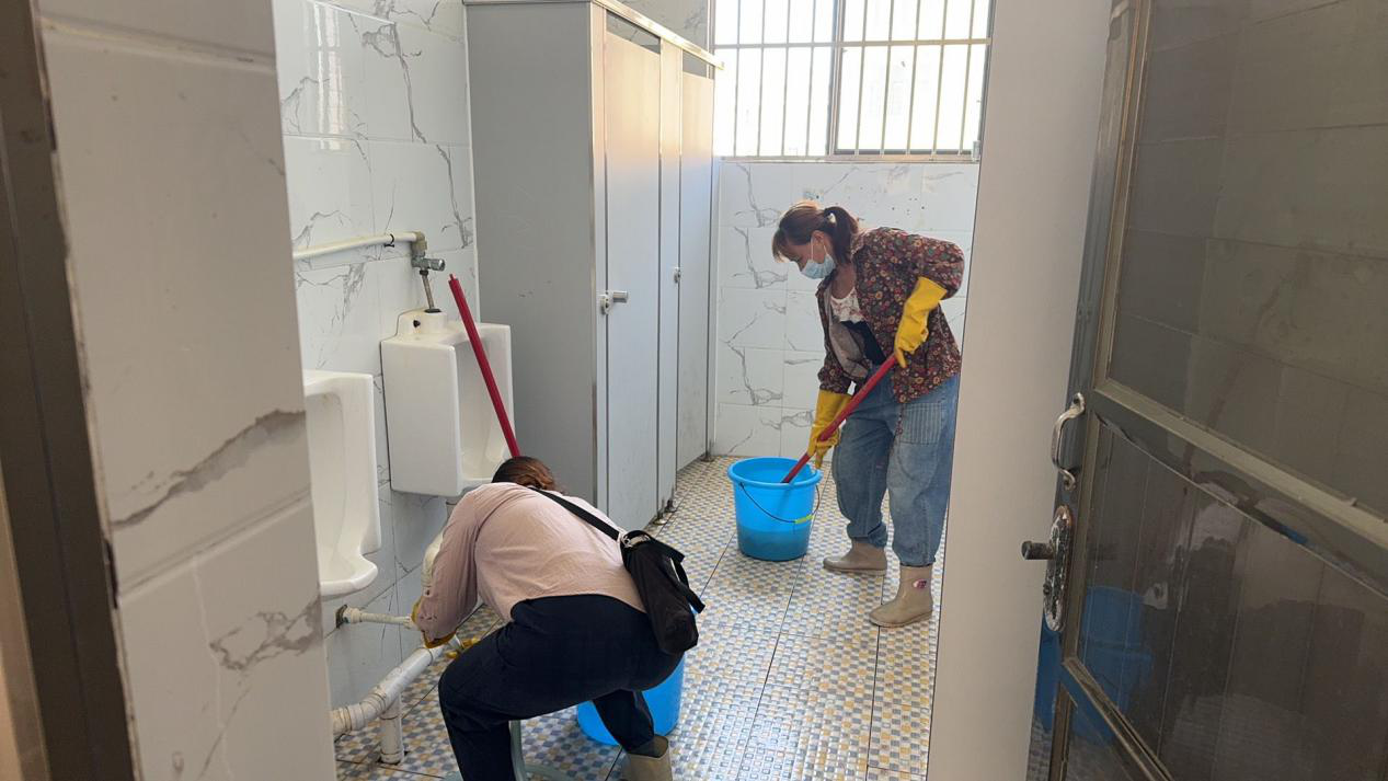 圖為保潔工人打掃教學(xué)樓衛(wèi)生間