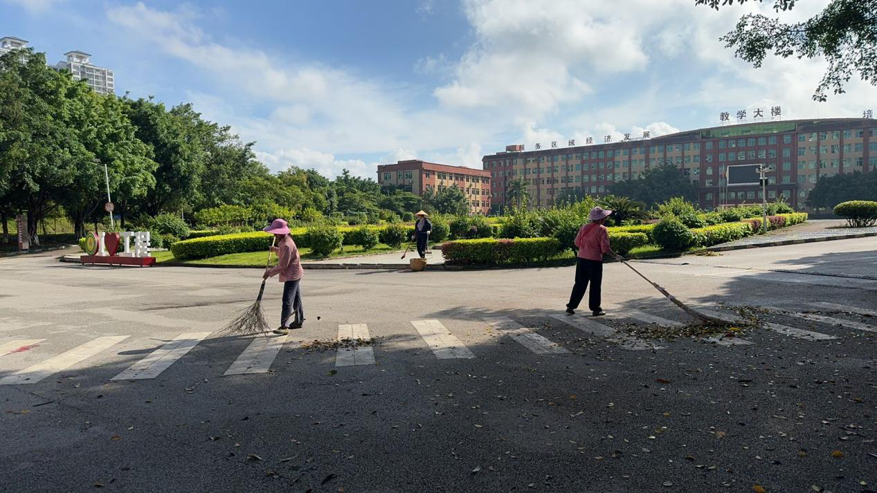 圖為保潔工人清掃校園道路