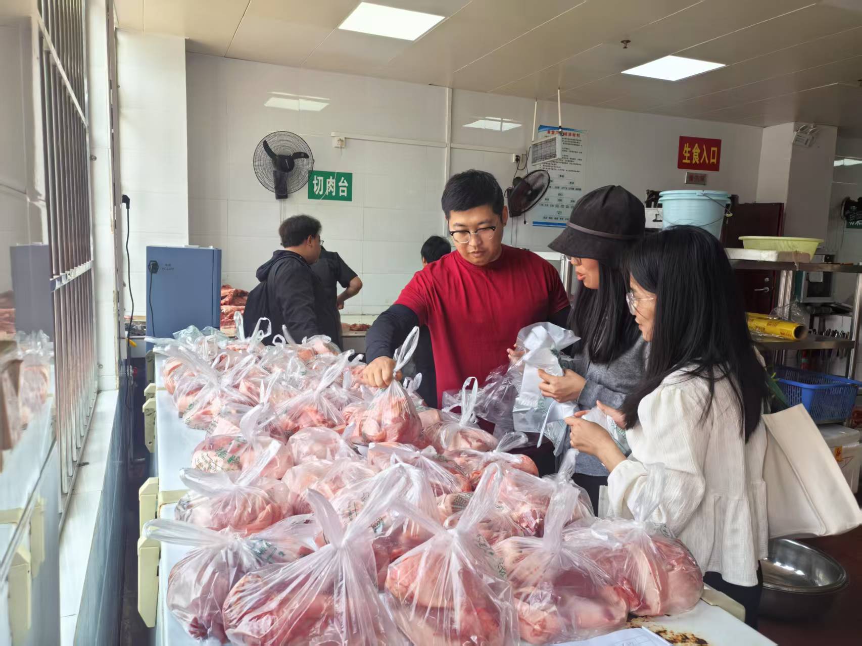 圖為教師領(lǐng)取豬肉